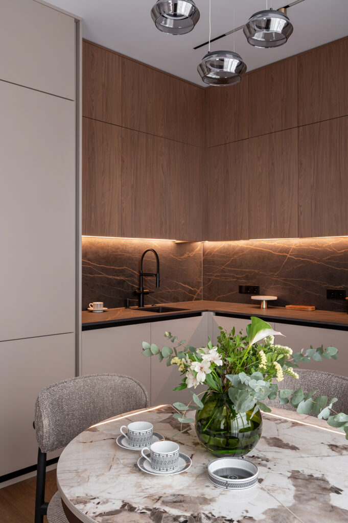 Здесь важно было создать не просто функциональность, а атмосферу. Чтобы утром было приятно входить в кухню с мягким тёплым светом, днём пространство работало удобно и логично, а вечером квартира превращалась в уютную, спокойную среду для отдыха.