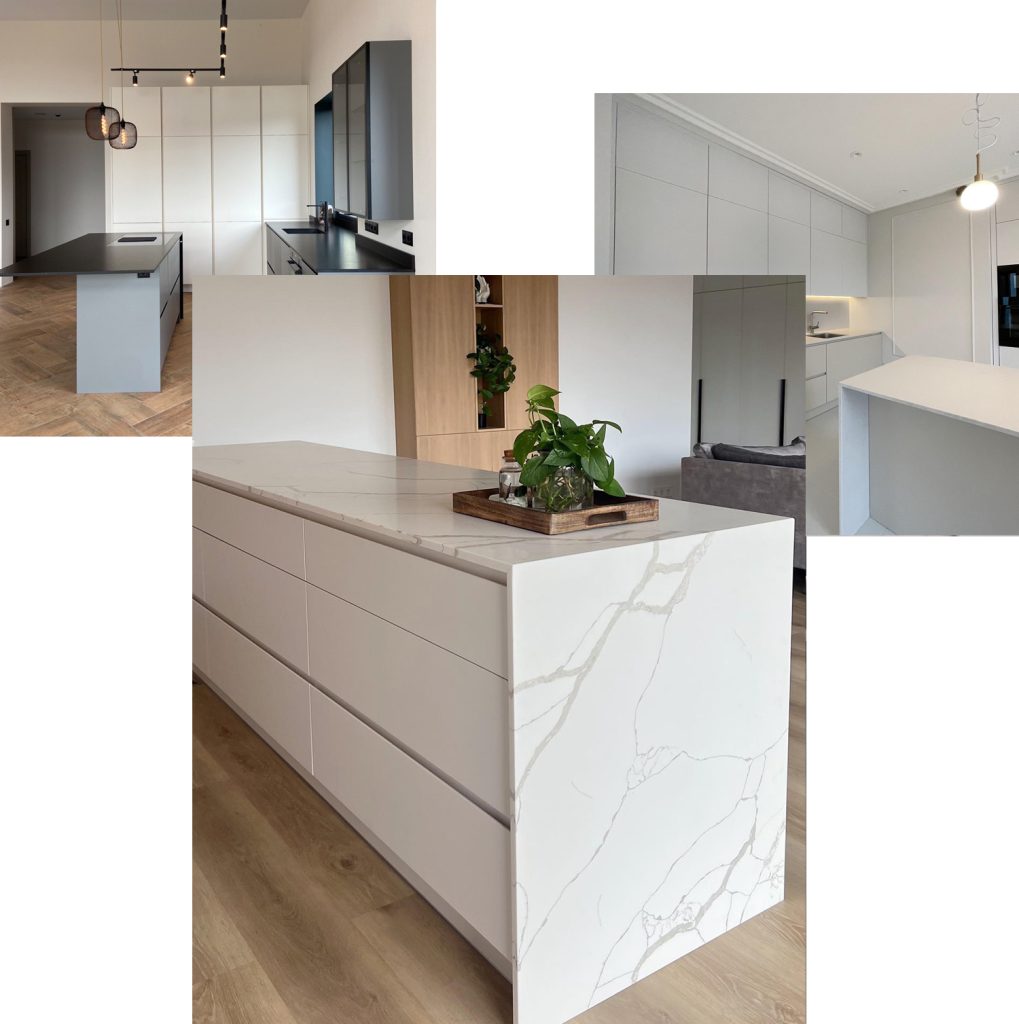 Столешница может быть монолитной или состоять из нескольких элементов. Выбор столешницы так же важен, как и фасады кухни или встроенная техника, поскольку именно её оттенок закрепляет и дополняет общую цветовую гамму кухни.