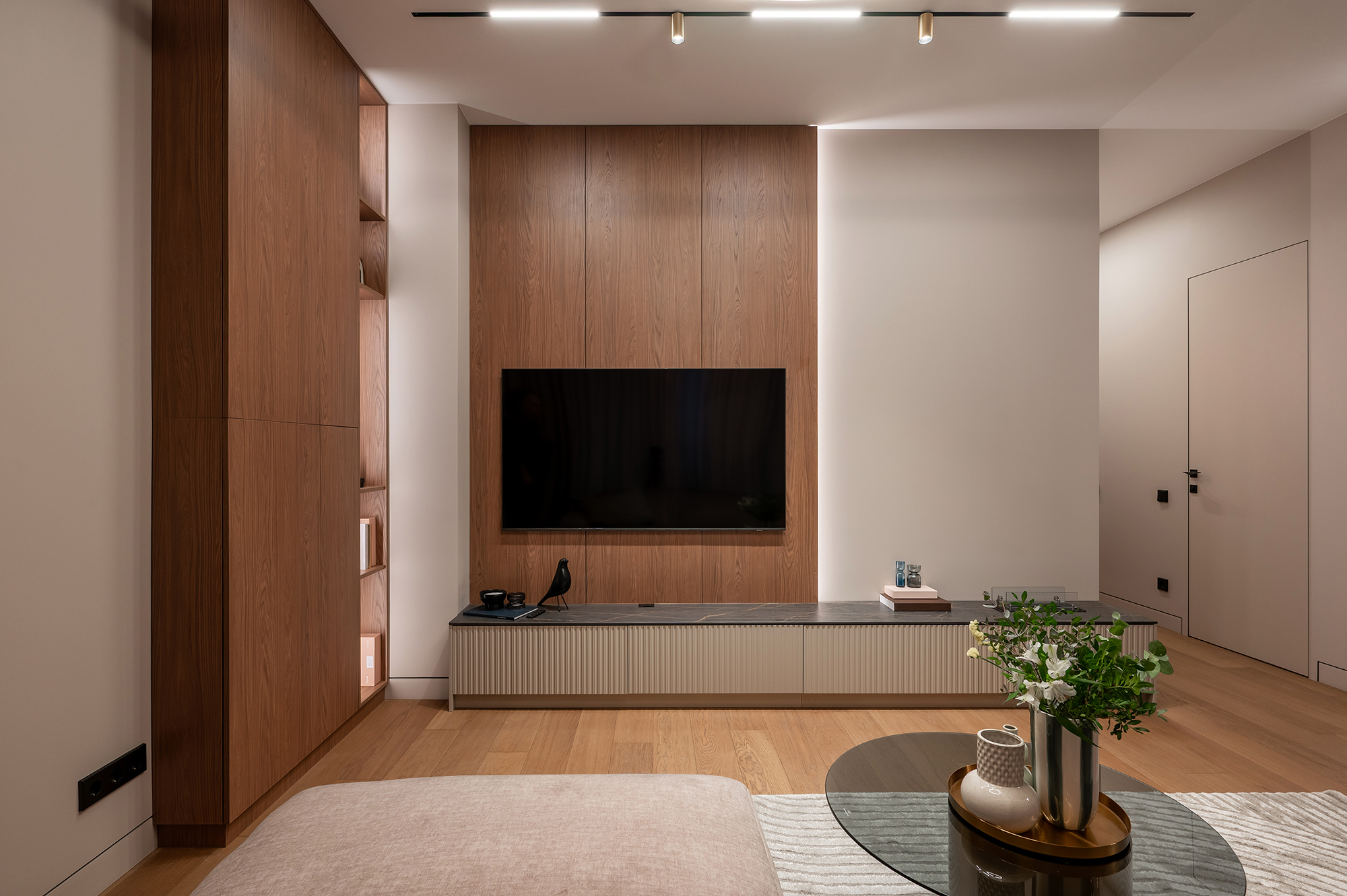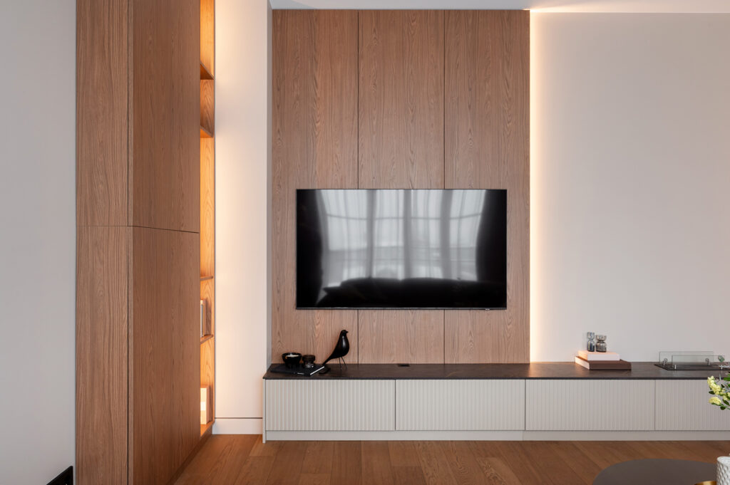 Этот проект — не про отдельную кухню. Это полностью реализованная квартира: кухня-гостиная, спальня, санузлы, встроенные шкафы, ТВ-зона и системы хранения. Всё пространство продумано как единая история, где мебель становится частью архитектуры и образа жизни.