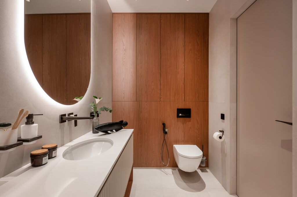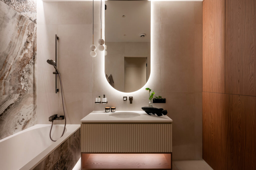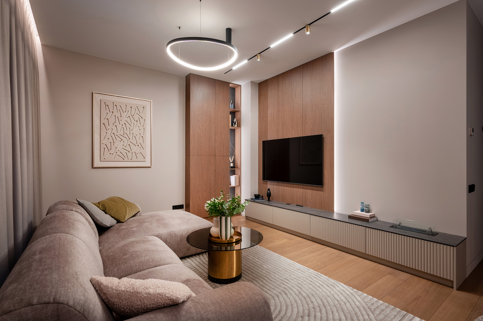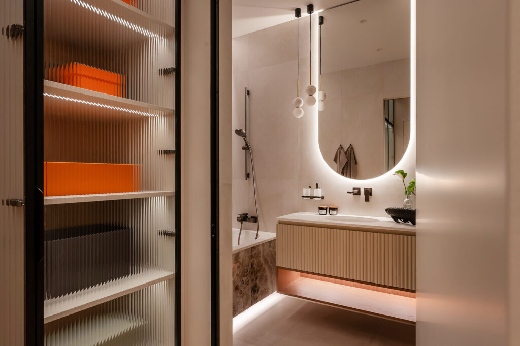 Подсветка интегрирована во всех ключевых зонах — на кухне, в шкафах, в ТВ-зоне, в санузлах. Используется LED-лента 3000K — тёплый комфортный свет, который подчёркивает фактуру материалов и делает интерьер живым и можно настраивать под разные сценарии: яркий рабочий свет днём и мягкая вечерняя атмосфера вечером.