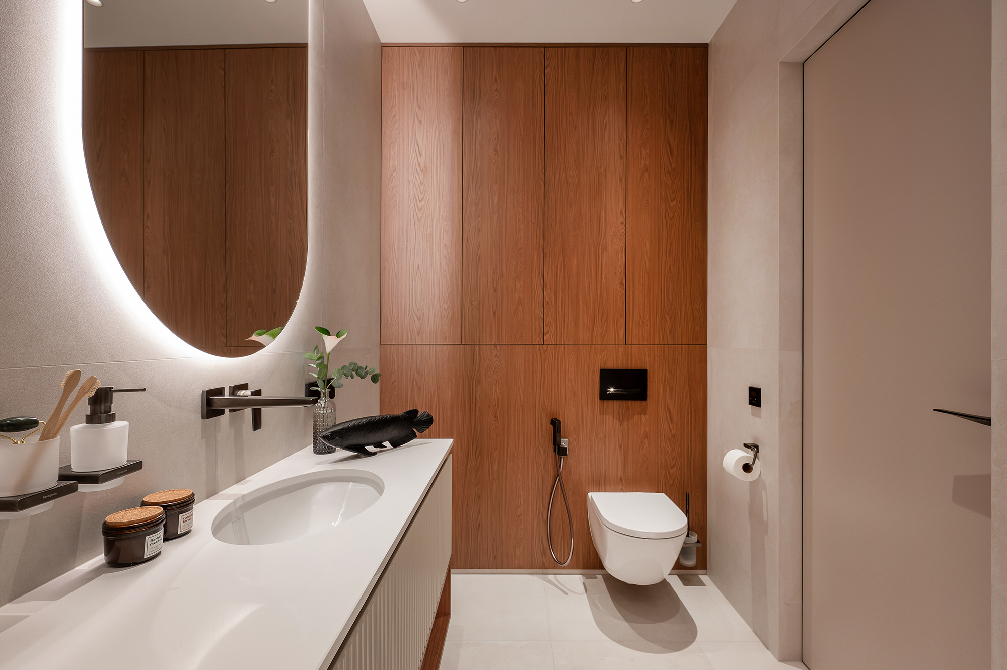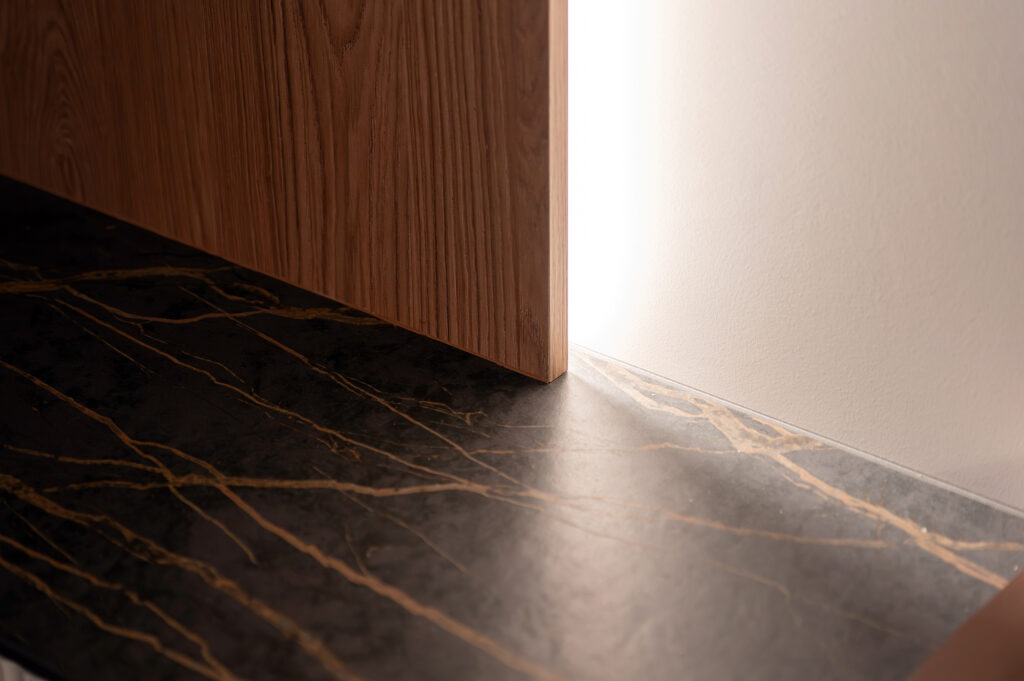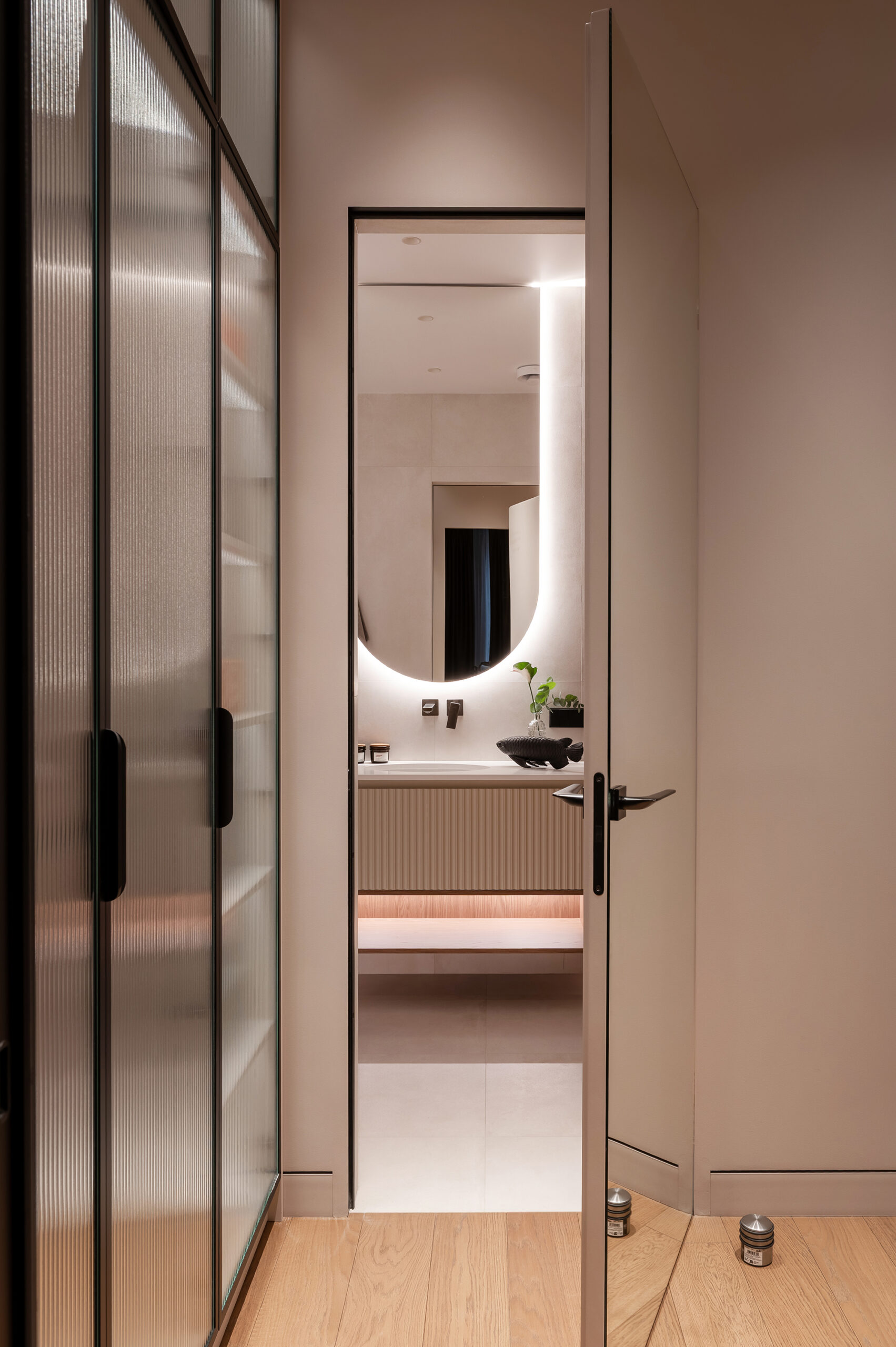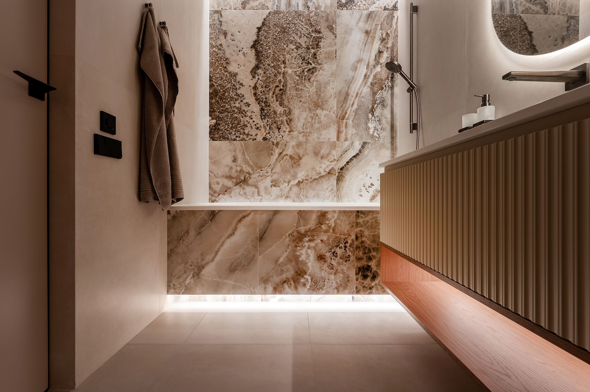 Подсветка интегрирована во всех ключевых зонах — на кухне, в шкафах, в ТВ-зоне, в санузлах. Используется LED-лента 3000K — тёплый комфортный свет, который подчёркивает фактуру материалов и делает интерьер живым и можно настраивать под разные сценарии: яркий рабочий свет днём и мягкая вечерняя атмосфера вечером.