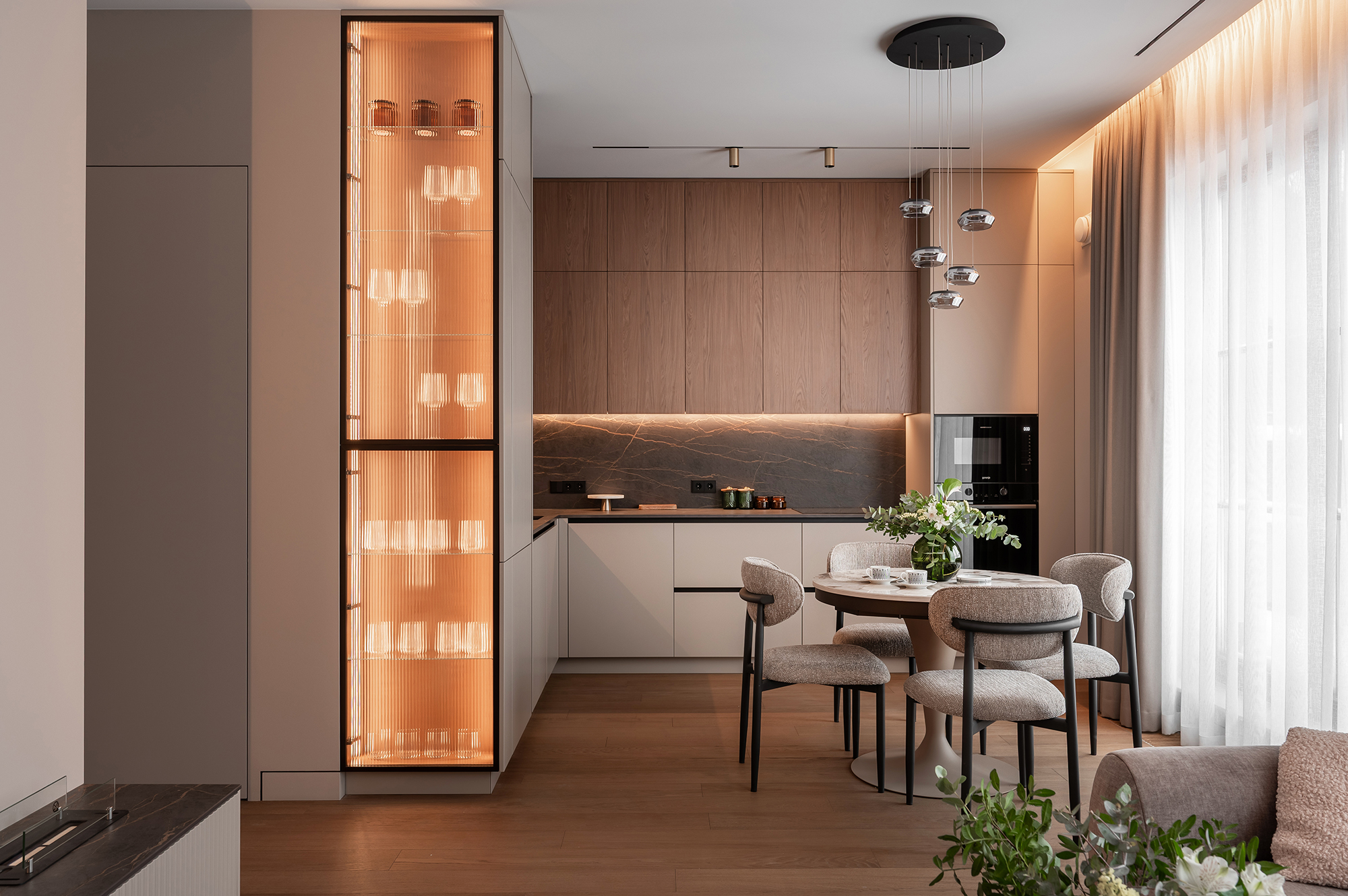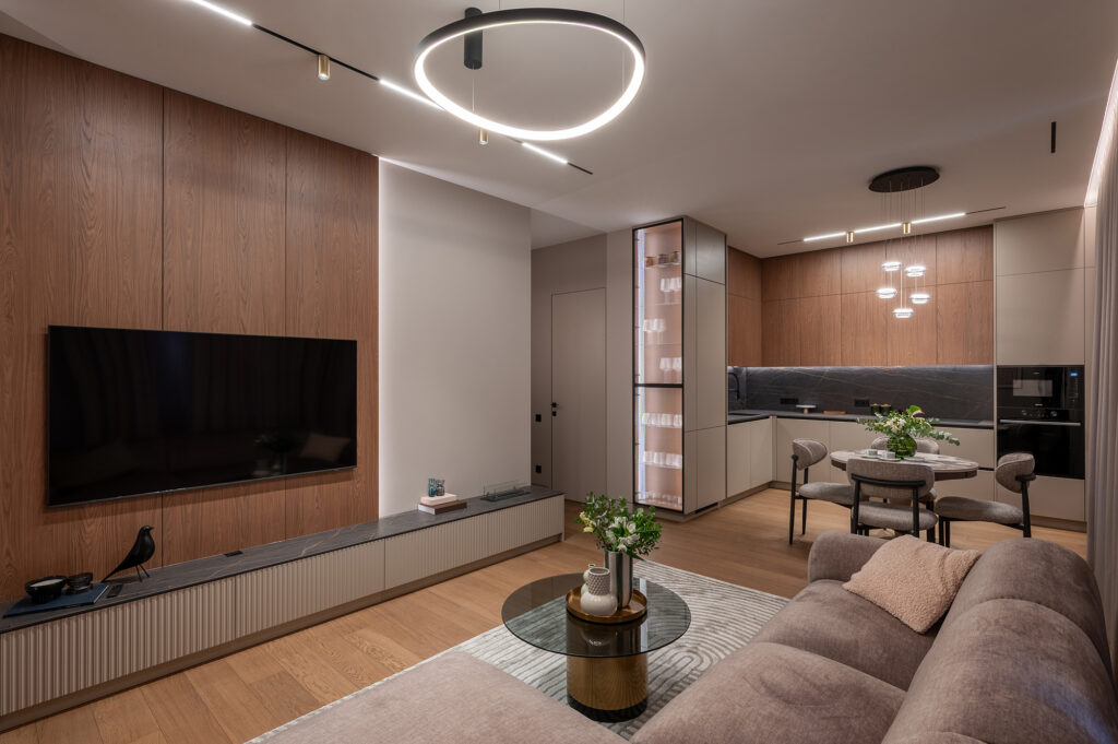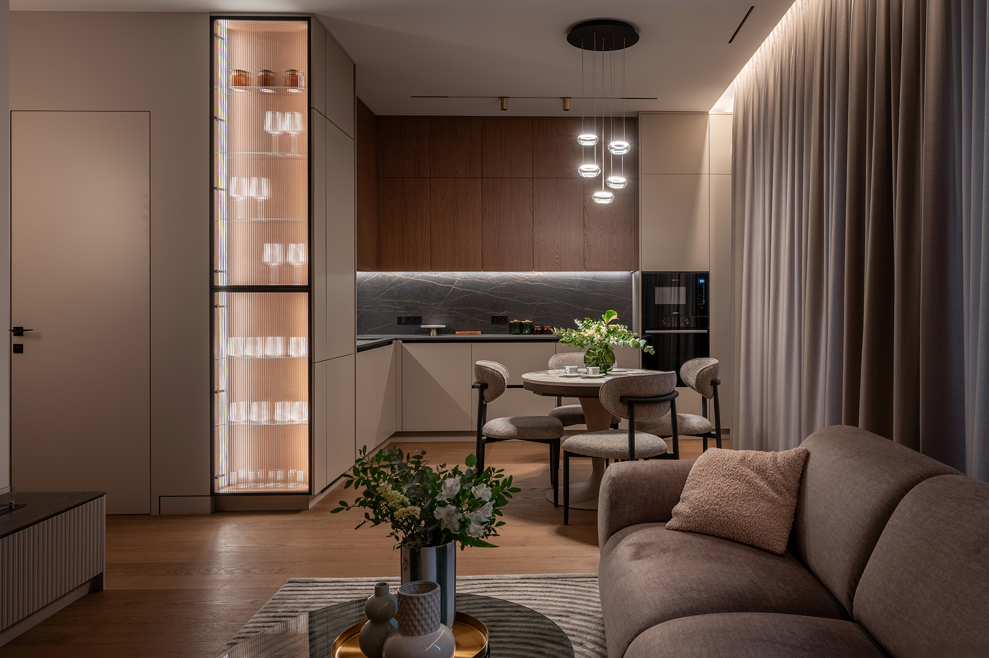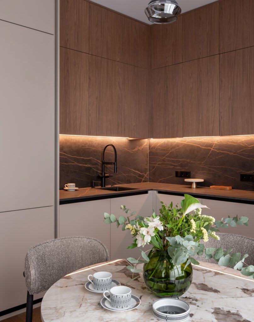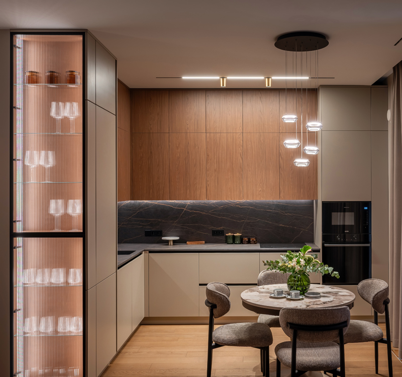 Здесь важно было создать не просто функциональность, а атмосферу. Чтобы утром было приятно входить в кухню с мягким тёплым светом, днём пространство работало удобно и логично, а вечером квартира превращалась в уютную, спокойную среду для отдыха.