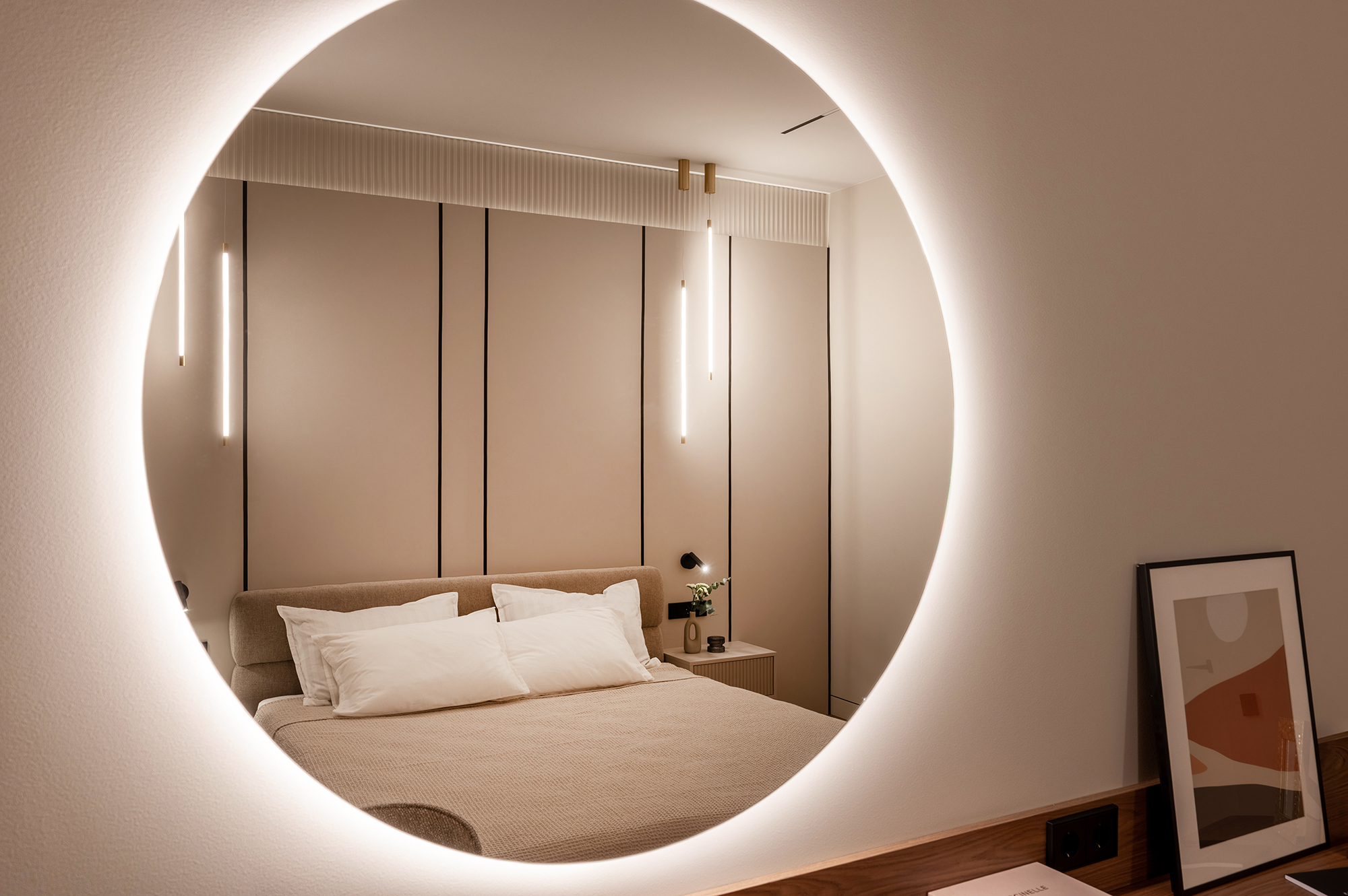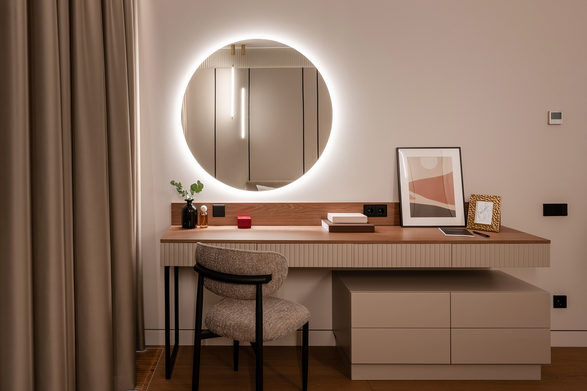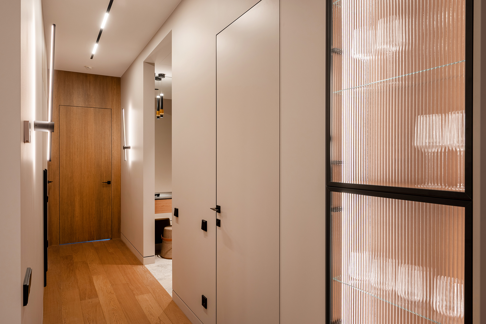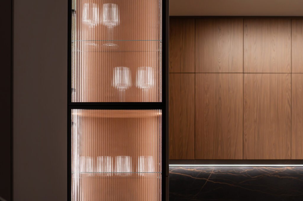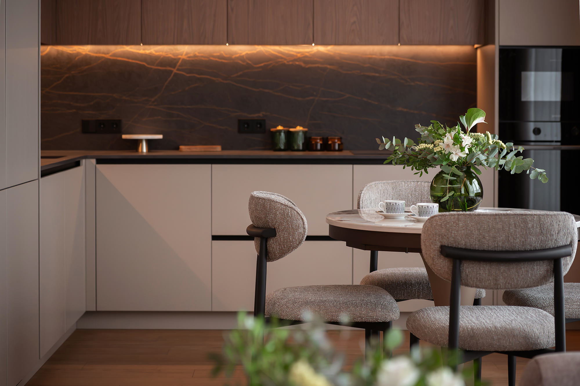 Здесь важно было создать не просто функциональность, а атмосферу. Чтобы утром было приятно входить в кухню с мягким тёплым светом, днём пространство работало удобно и логично, а вечером квартира превращалась в уютную, спокойную среду для отдыха.