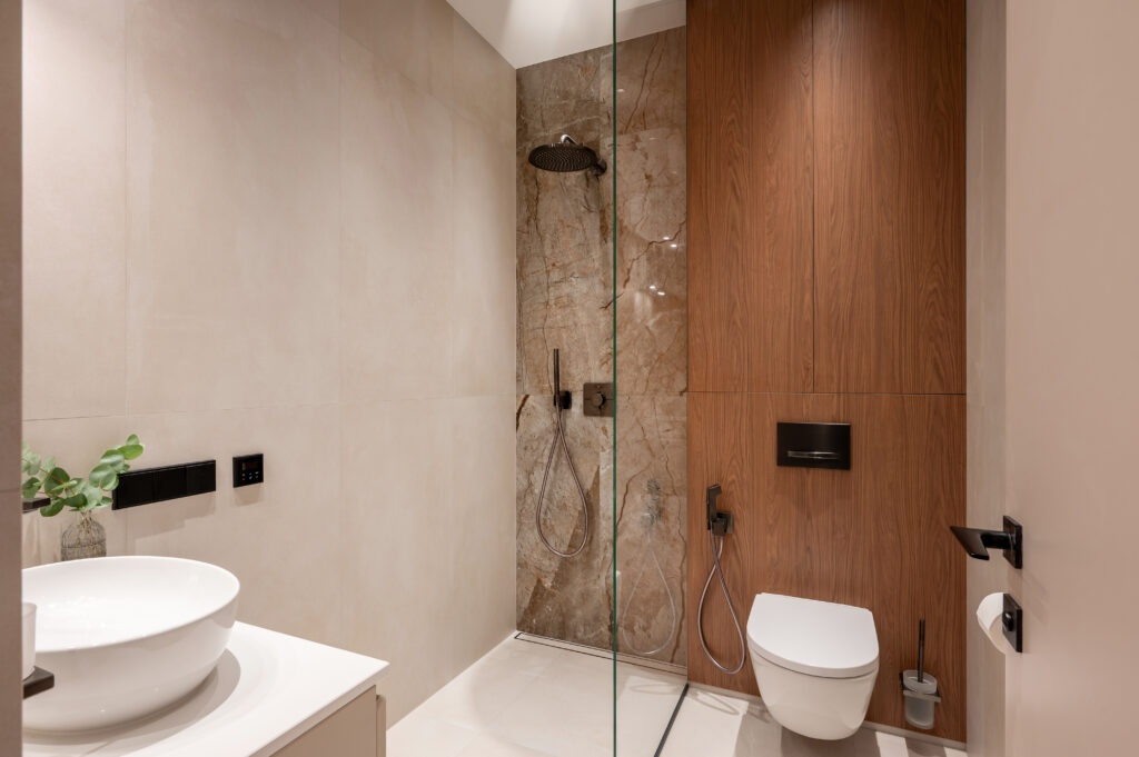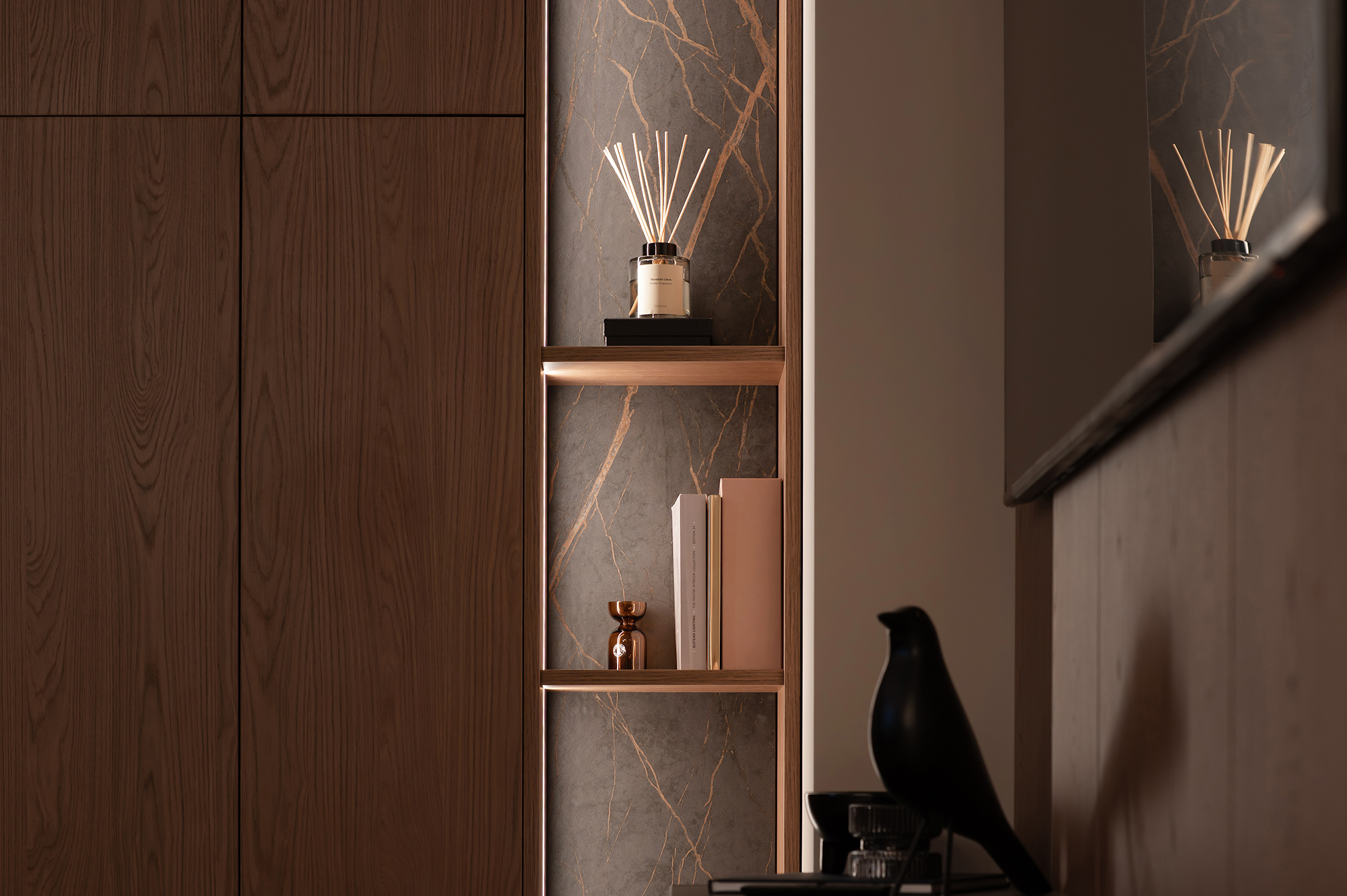 Мы используем только качественные материалы известных производителей. Тёплая древесная текстура мягко перекликается с оттенками стен и напольного покрытия. Матовые поверхности добавляют глубины и тактильности. Цвета не конкурируют — они поддерживают друг друга.